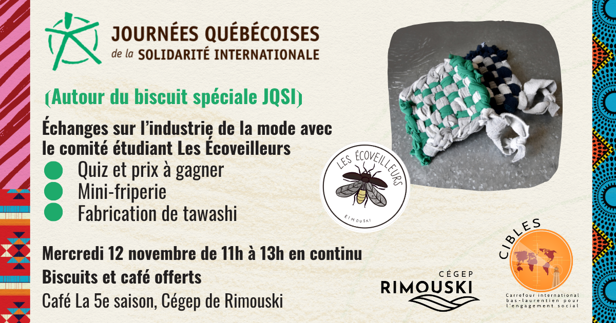 En collaboration avec la 5e saison et le comité étudiant les Éco-veilleurs ACTES, les étudiant.e.s du Cégep de Rimouski sont conviés à partager café et biscuits autour d’une activité de friperie et de quiz pour en apprendre davantage sur l’industrie textile.