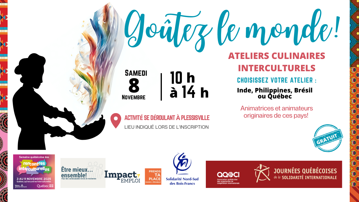 Invitation à la découverte des saveurs du Brésil, de l’Ukraine, du Cameroun et du Québec avec des animateurs-trices originaires de ces pays. Faites votre choix parmi ces quatre recettes à préparer et à déguster !