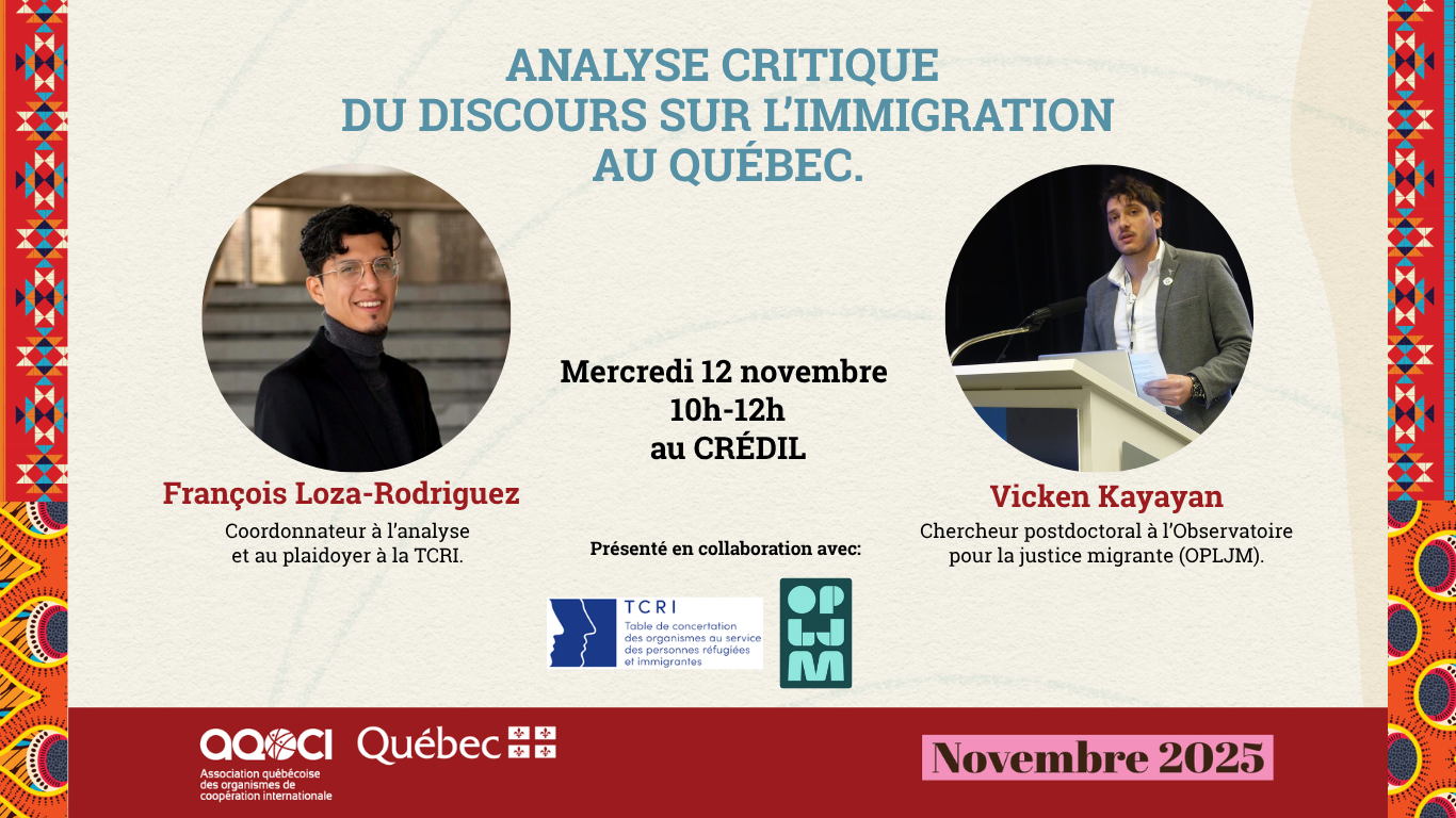 Cette rencontre propose une réflexion approfondie sur les enjeux sociétaux soulevés par les discours actuels opposés à l’immigration, ainsi que sur les répercussions des projets de loi récents liés à l’immigration et à la laïcité. L’analyse servira à mettre en lumière plusieurs tendances préoccupantes, notamment la polarisation politique du sujet, l’instrumentalisation des personnes immigrantes comme boucs émissaires, et la construction d’une distinction problématique entre « bons » et « mauvais » immigrants.