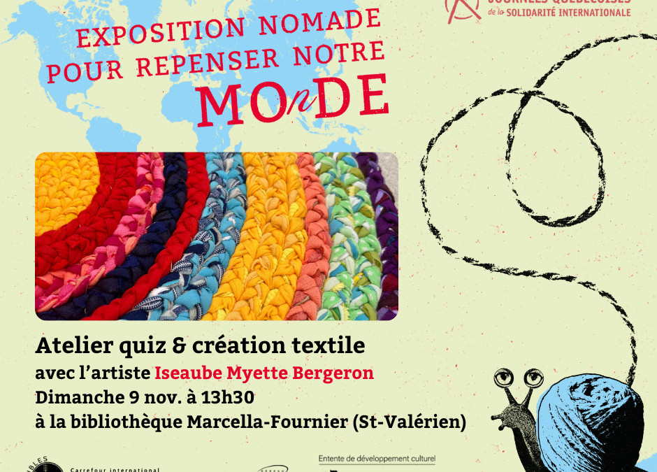 Ouvert à tous les âges, cet atelier commence par un quiz-jasette sur les enjeux de l’industrie de la mode, animé par une animatrice du CIBLES. Puis, place à la création avec l’artiste Iseaube Myette Bergeron ! Vous réaliserez une petite œuvre en tissus récupérés selon la technique traditionnelle du tapis tressé, qui transforme des vêtements usagés en créations durables.