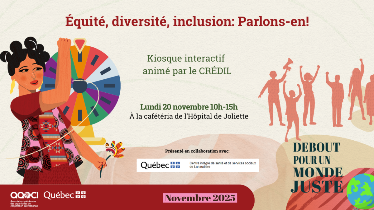 Ce sera l’occasion de découvrir notre mission en solidarité internationale, d’échanger sur les enjeux liés à l’équité, à la diversité et à l’inclusion, et de mieux comprendre les réalités des personnes issues de l’immigration dans notre belle région de Lanaudière.
