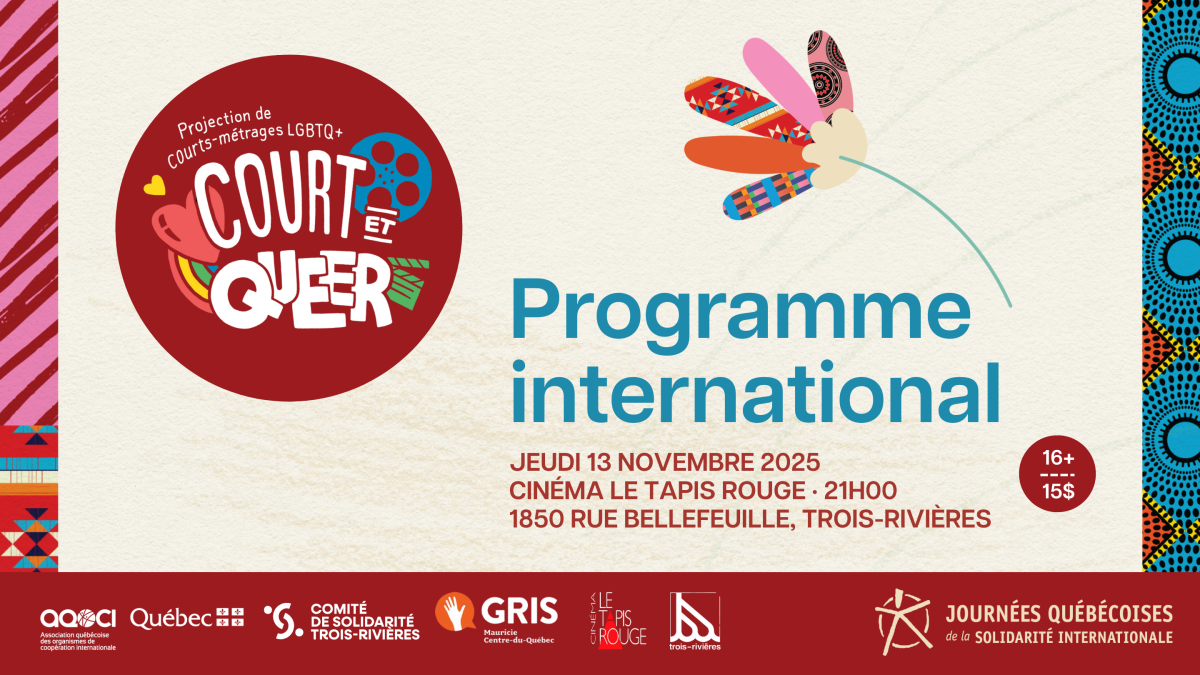 Le jeudi 13 novembre 2025 à 21 h, assistez à la présentation d’un programme international (16 ans et plus) lors du festival Courts et Queer au Cinéma Le Tapis Rouge. Avant la projection, le CS3R animera une introduction pour situer les films et les thématiques abordées.