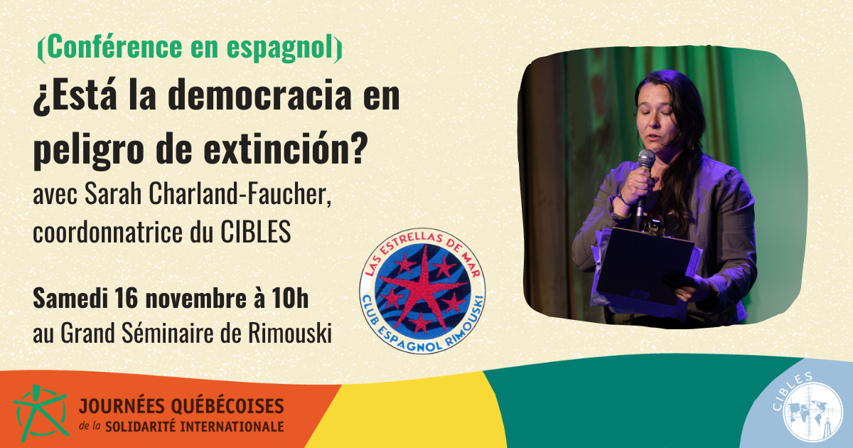 Vous êtes invité.e.s dès 10h à venir pratiquer en sous-groupes quelques notions d’espagnol sous forme de jeux. Puis, à 10h30, Sarah Charland-Faucher, coordonnatrice du CIBLES et des JQSI 2024 animera la conférence en espagnol: ¿Está la democracia en peligro de extinción?