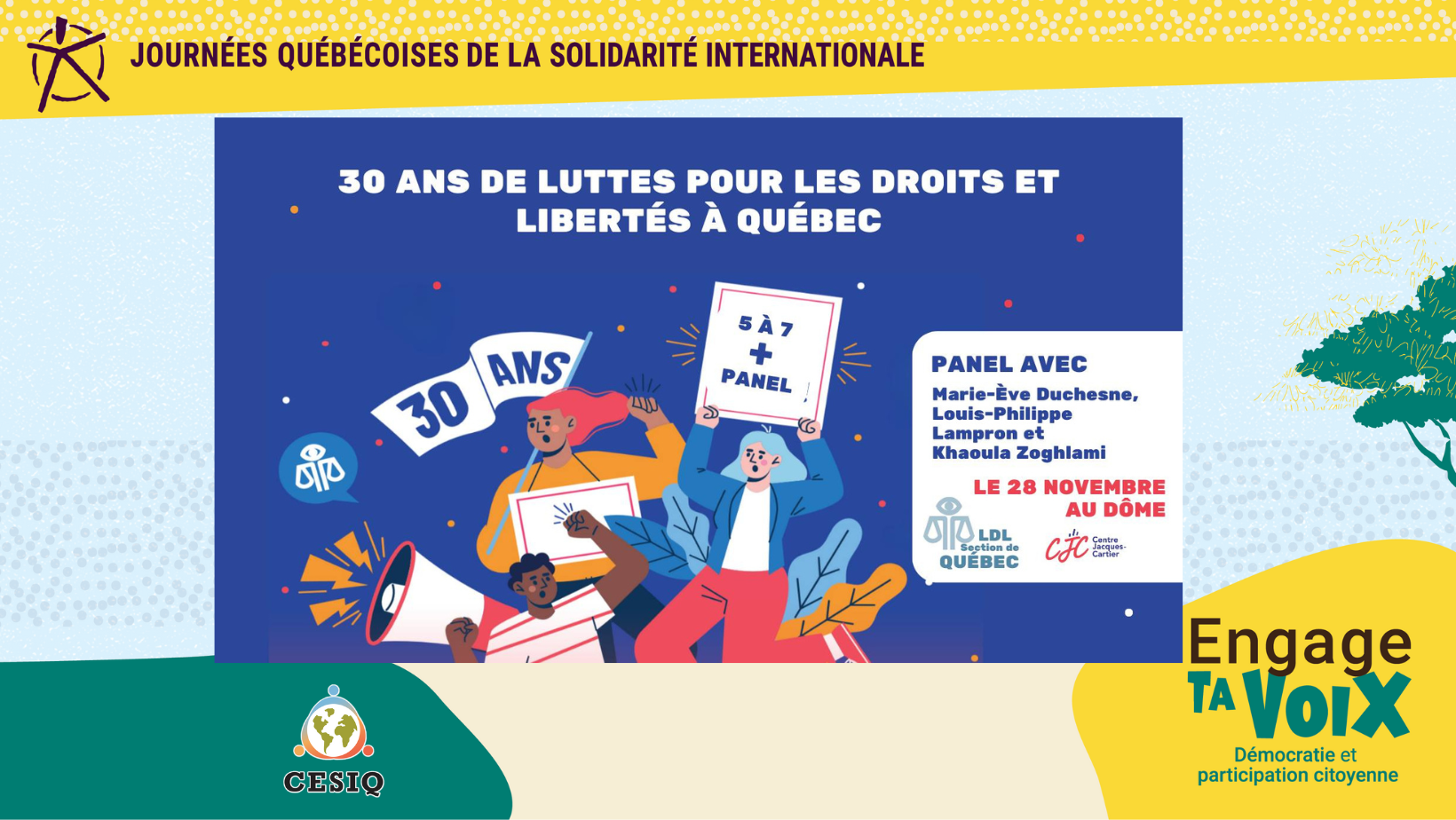 La Ligue des droits et libertés – Section de Québec vous convie à une soirée sur le thème des luttes pour les droits et libertés dans le cadre des célébrations de son 30ème anniversaire!