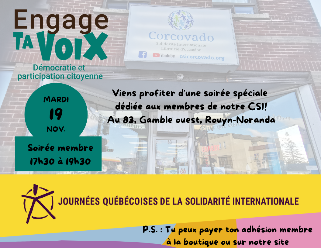 L’activité se tiendra dans notre boutique solidaire au Centre de Solidarité International Corcovado et Librairie, 83 Gamble Ouest, Rouyn-Noranda.