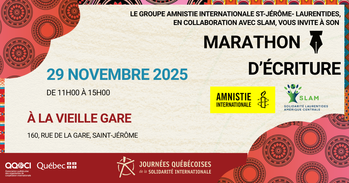 Les membres du groupe d’Amnistie internationale St-Jérôme/Laurentides, de concert avec SLAM, ont le plaisir de vous inviter à leur Marathon d’écriture annuel, le samedi 29 novembre entre 11h et 15h, à la Vieille-Gare de St-Jérôme 160 rue de la Gare.