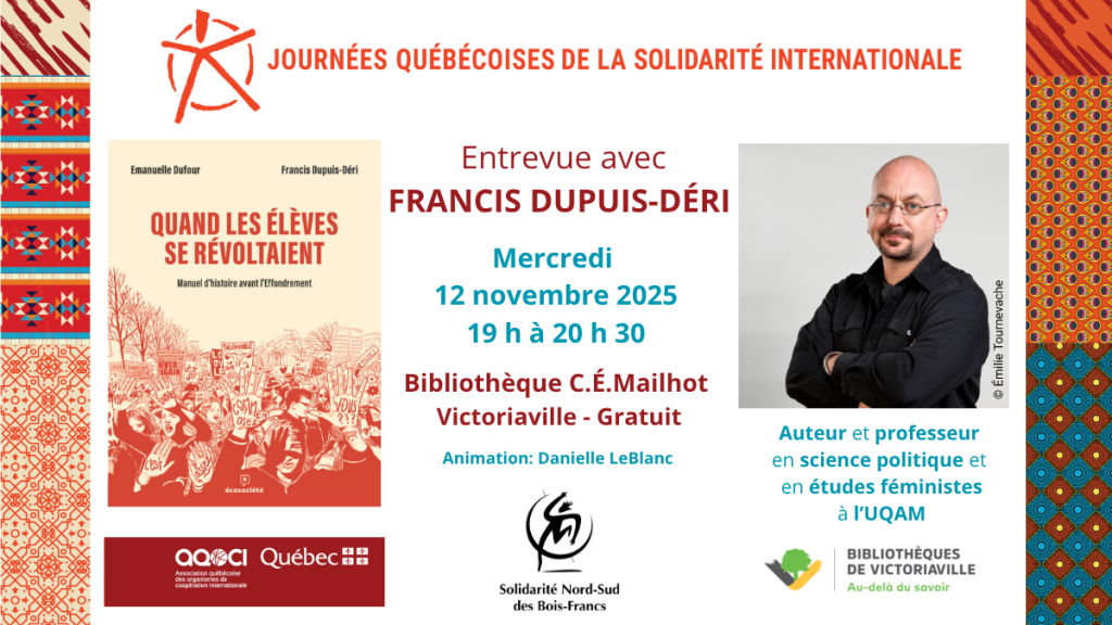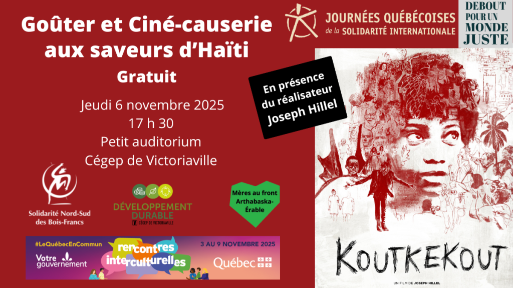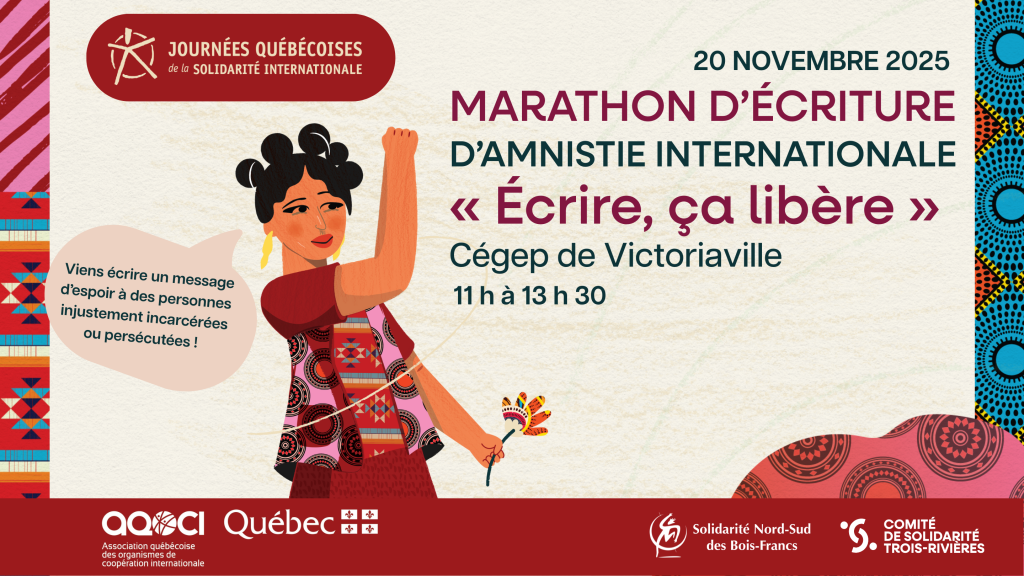 Organisé par : Aide internationale pour l’enfance, Amitié Gatineau Monde, AQOCI, Carrefour d’éducation à la solidarité internationale – Québec, Carrefour de solidarité internationale, Centre de Solidarité internationale Corcovado, Centre de solidarité internationale du Saguenay-Lac-Saint-Jean (CSI-SLSJ), CIBLES, Comité de Solidarité / Trois-Rivières, SLAM, Solidarité Nord-Sud des Bois-Francs (SNSBF)