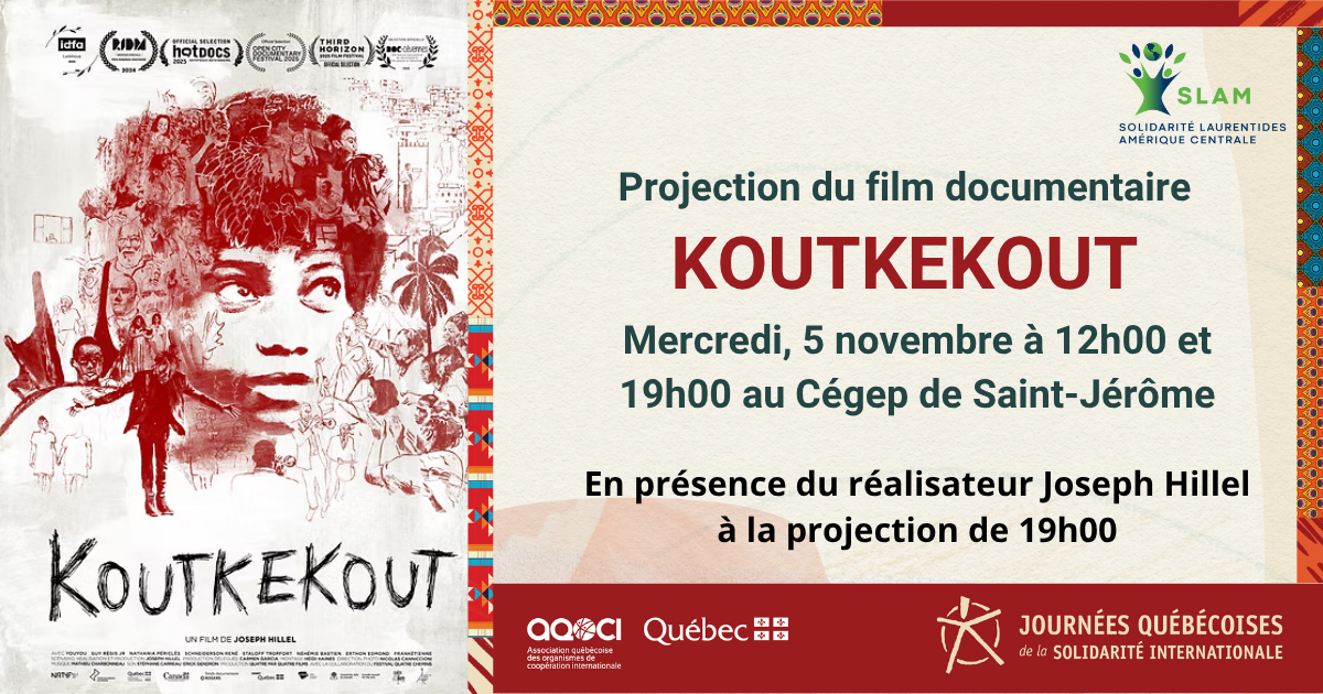 Le mercredi 5 novembre, Solidarité Laurentides Amérique centrale (SLAM) organise deux projections gratuites du film documentaire : Koutkekout au Cégep de Saint-Jérôme. Elles seront suivies d’une période d’échanges avec les animateurs de SLAM et le public.