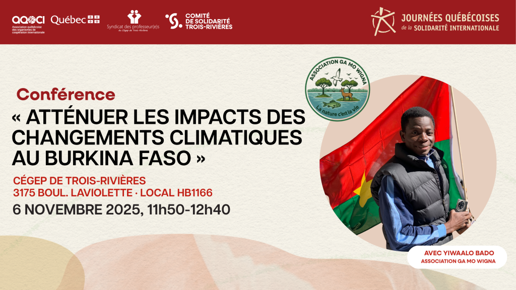 Organisé par : Aide internationale pour l’enfance, Amitié Gatineau Monde, AQOCI, Carrefour d’éducation à la solidarité internationale – Québec, Carrefour de solidarité internationale, Centre de Solidarité internationale Corcovado, Centre de solidarité internationale du Saguenay-Lac-Saint-Jean (CSI-SLSJ), CIBLES, Comité de Solidarité / Trois-Rivières, SLAM, Solidarité Nord-Sud des Bois-Francs (SNSBF)
