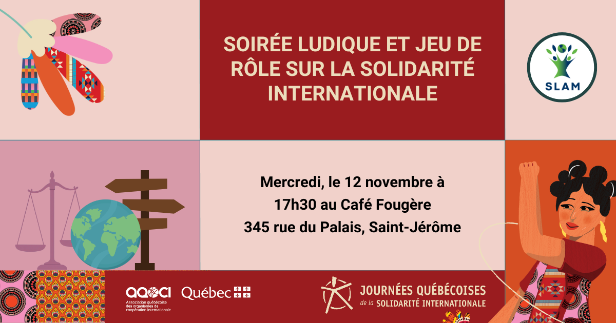Venez passer une soirée ludique en compagnie de l’équipe de SLAM pour discuter de solidarité internationale, réfléchir ensemble sur les enjeux internationaux et jouer au jeu de rôle Le périple, développé par Projet Accompagnement Solidarité Colombie (PASC)!