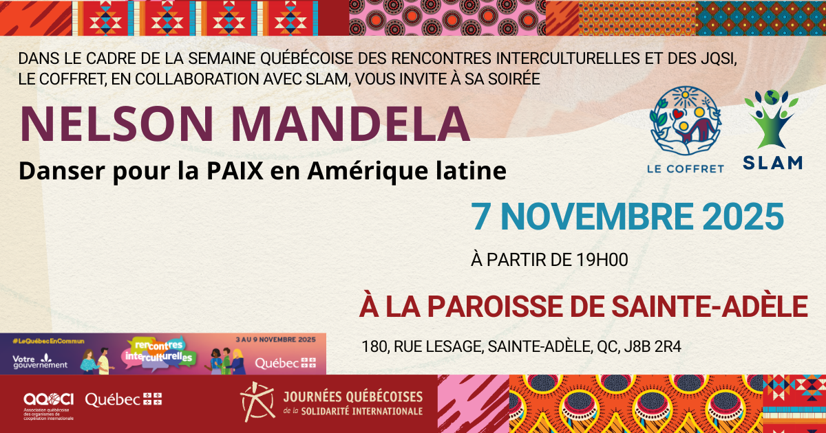 Dans le cadre de la Semaine Québécoise des Rencontres Interculturelles (SQRI) et des Journées Québécoises de la Solidarité Internationale (JQSI), le COFFRET et le SLAM vous invitent à une soirée conviviale de danse et de musique d’Amérique latine dans le but d’honorer les paroles de Nelson Mandela ; « Danser et non pleurer car c’est en dansant que nous pourrons vivre en paix ».