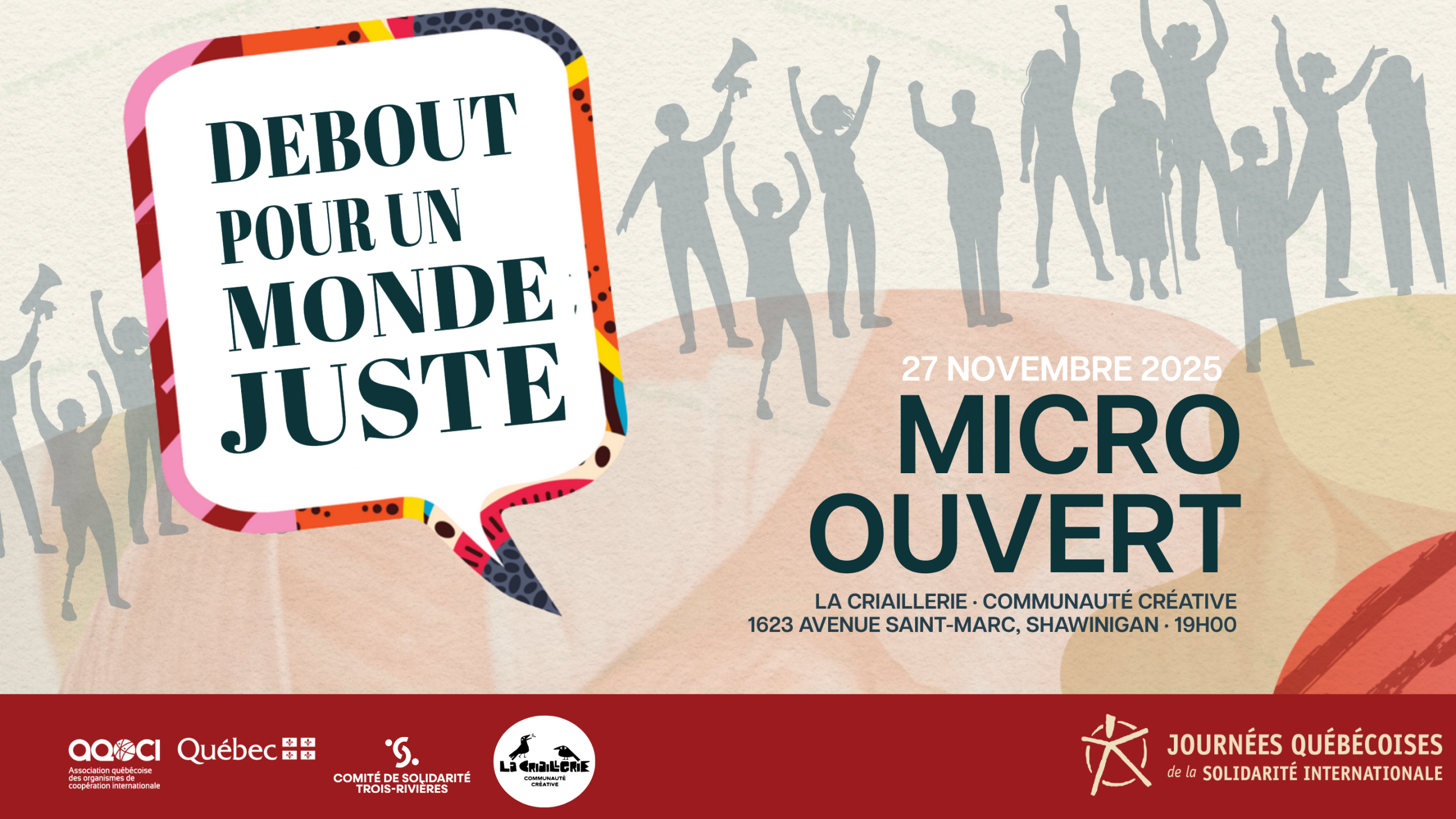 Le 27 novembre à 19 h, participez à la soirée de poésie « Debout pour un monde juste » à La Criaillerie – Communauté créative à Shawinigan. Un micro ouvert pour partager vos poèmes ou simplement écouter des textes engagés qui célèbrent la justice sociale et la solidarité.