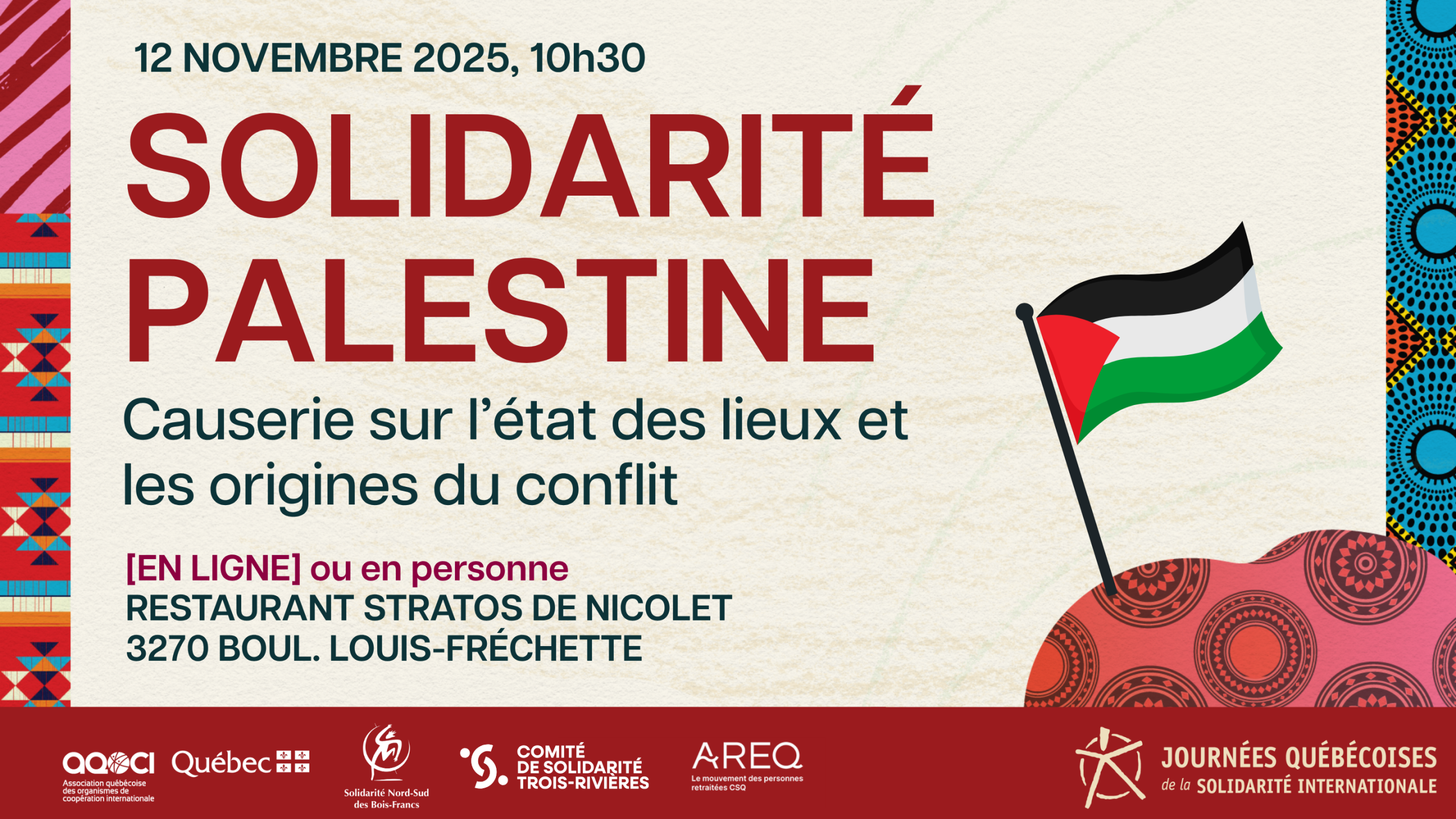 Le 12 novembre, participez à la causerie « SOLIDARITÉ PALESTINE : État des lieux et origines du conflit » animée par le Comité de Solidarité/Trois-Rivières et organisée en collaboration avec l’AREQ Nicolet et Solidarité Nord-Sud des Bois-Francs.