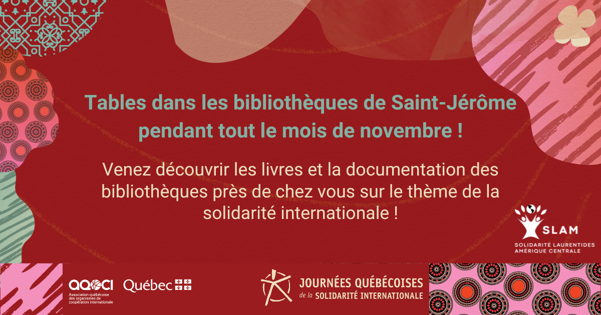 Solidarité Laurentides Amérique centrale (SLAM) collabore avec les bibliothèques de la Ville de Saint-Jérôme, du Cégep de Saint-Jérôme et de l’Université du Québec en Outaouais, au campus de Saint-Jérôme, pour rendre disponible aux usagères et usagers des bibliothèque des livres et documents de leurs différentes collections sur le thème de la solidarité internationale. Des tables seront installées à l’entrée des bibliothèques tout le mois de novembre à :