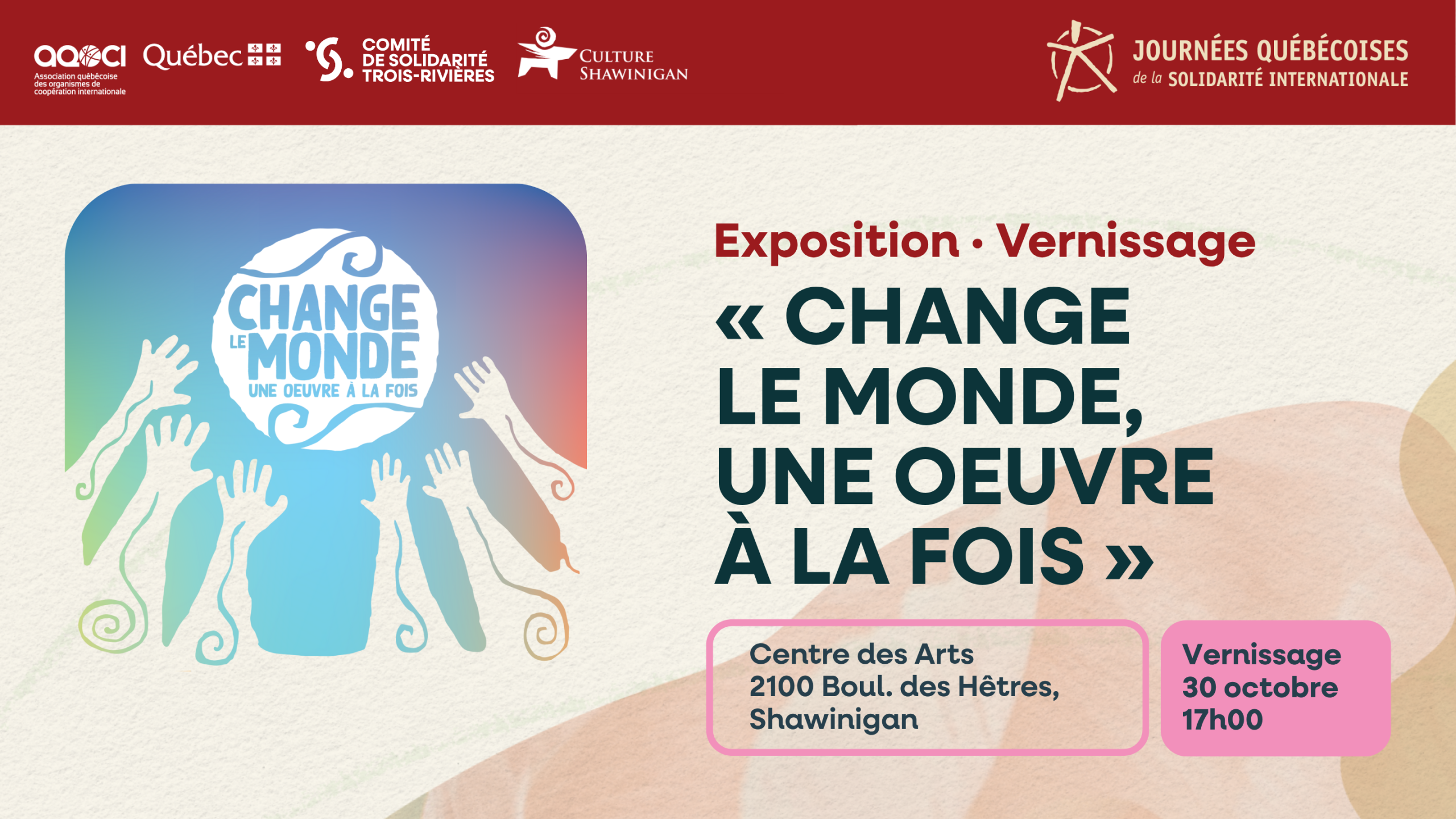 L’exposition est présentée tout le mois de novembre 2025 au Centre des arts de Shawinigan, avec un vernissage le 30 octobre à 17 h — une belle occasion de venir célébrer l’art et l’engagement citoyen !