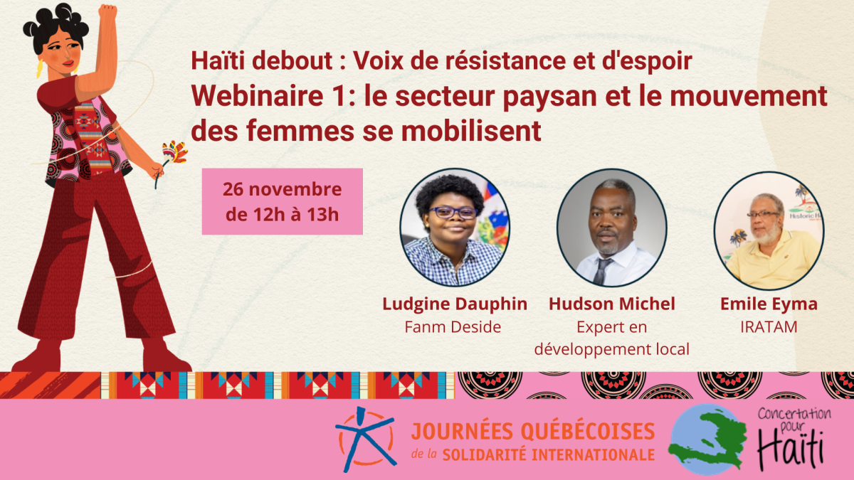 Dans le cadre des Journées québécoises de la solidarité internationale (JQSI) et des 12 jours d’action contre la violence faite aux femmes, la Concertation pour Haïti (CPH) propose à ses membres ainsi qu’au grand public un webinaire avec deux organisations haïtiennes partenaires le 26 novembre de 12h à 13h.